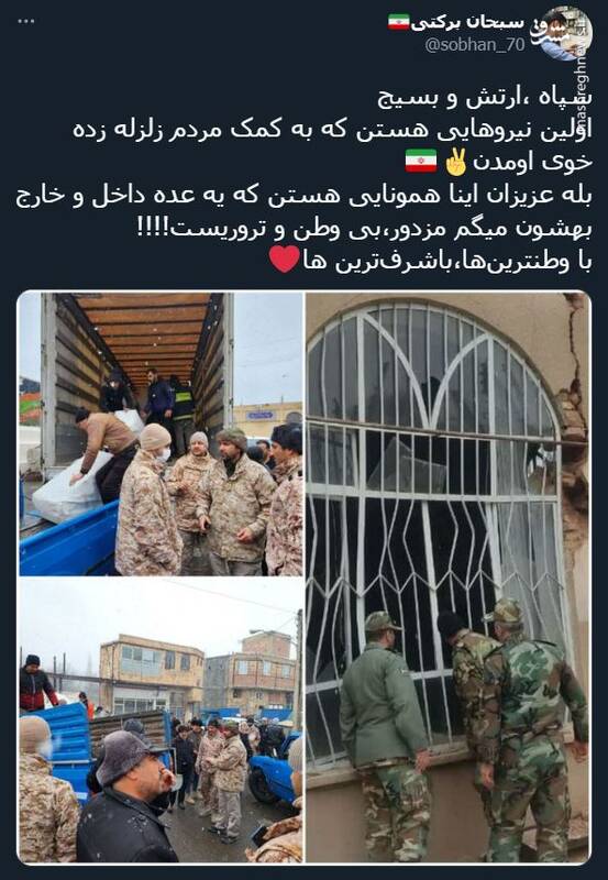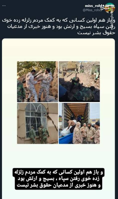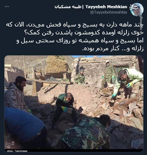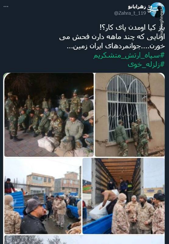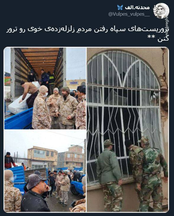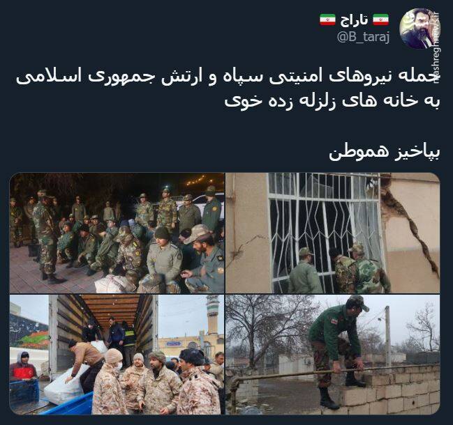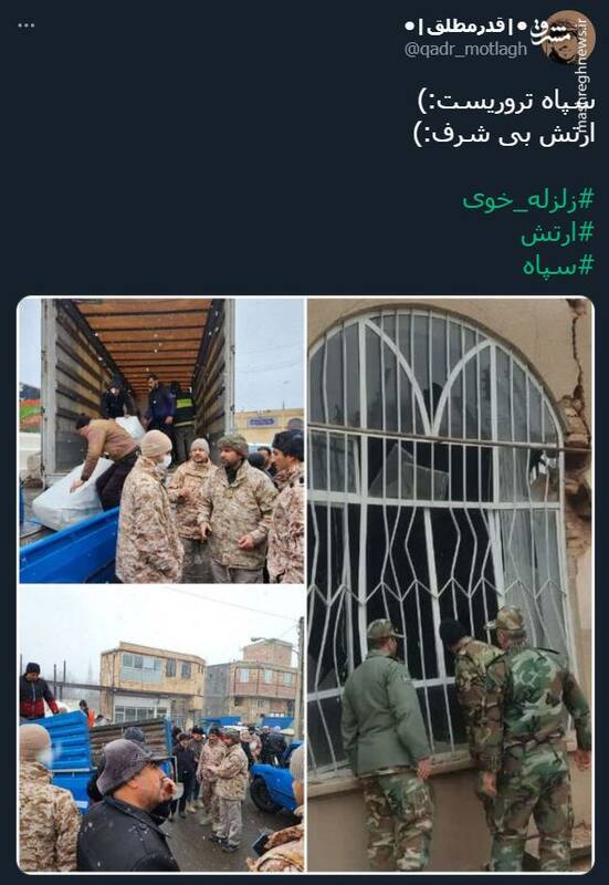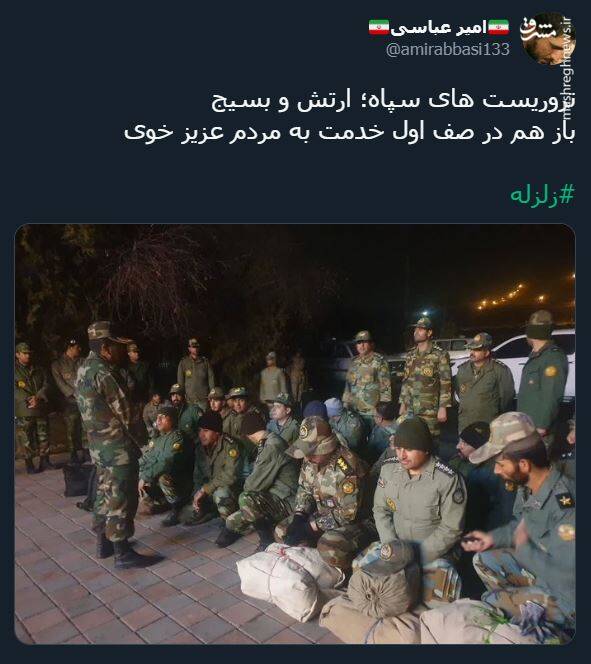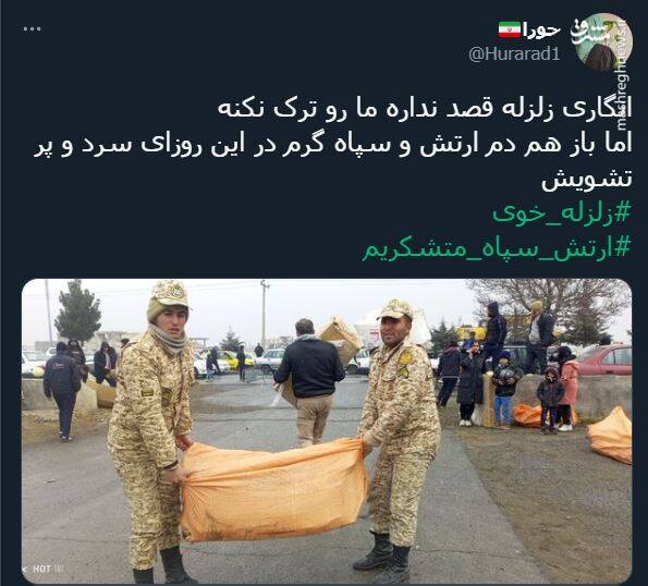 کاربران توئیتری در فضای مجازی نسبت به حضور نیروهای نظامی از جمله سپاه در این مناطق واکنش نشان داده و تصاویر خدمترسانی آن ها به زلزله زدگان را منتشر کردند.