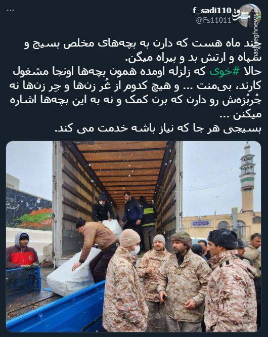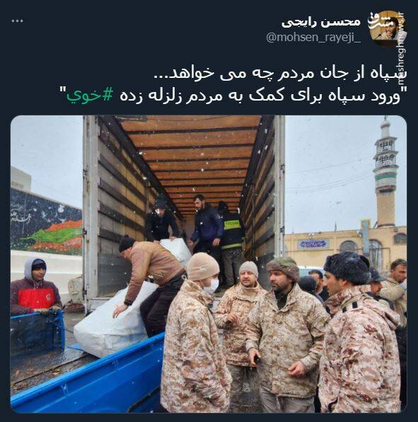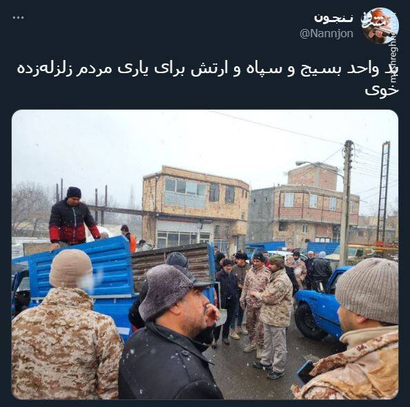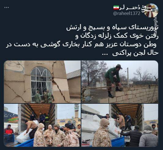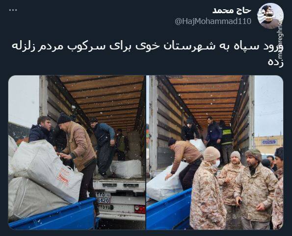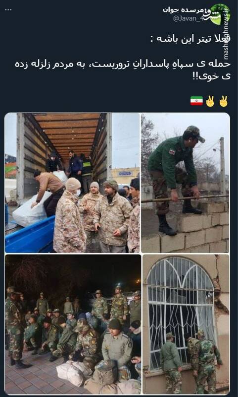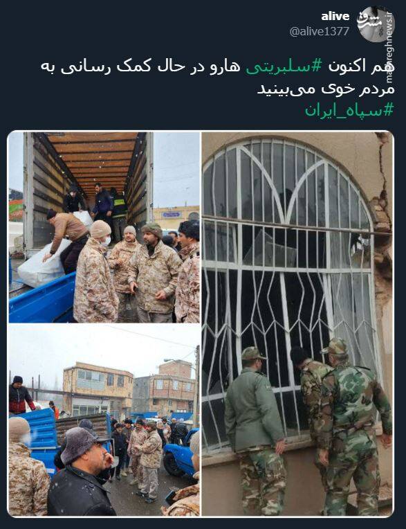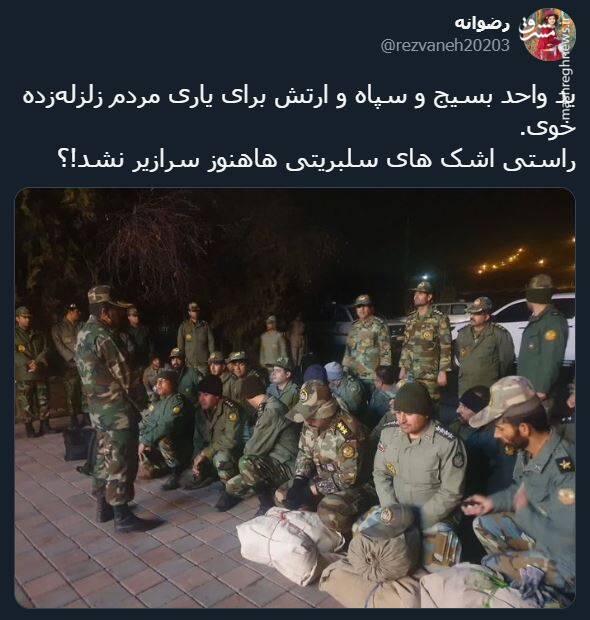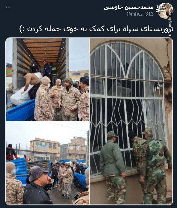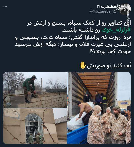 کاربران توئیتری در فضای مجازی نسبت به حضور نیروهای نظامی از جمله سپاه در این مناطق واکنش نشان داده و تصاویر خدمترسانی آن ها به زلزله زدگان را منتشر کردند.