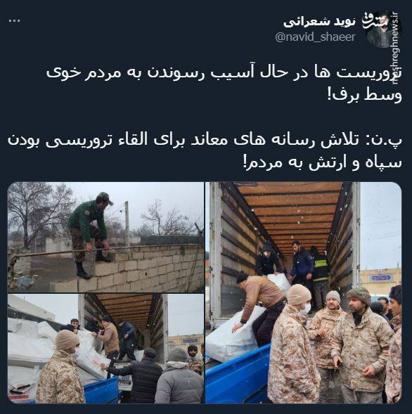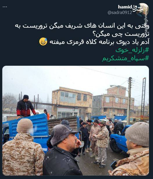 این کاربران به کنایه حضور پاسداران در این مناطق را «اعزام تروریست ها» نوشتند تا قطعنامه اخیر پارلمان اروپا علیه سپاه پاسداران مبنی بر معرفی این سازمان به عنوان «سازمان تروریستی» را یادآوری کرده و به طعنه خطاب به مخاطبانشان، خدمترسانی های نیروهای نظامی کشور از جمله سپاه را گوشزد کردند.