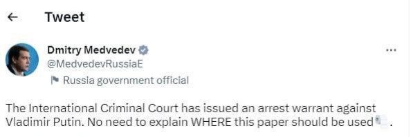 او در توییتر نوشت: «دیوان بینالمللی کیفری علیه ولادیمیر پوتین قرار بازداشت صادر کرده. نیازی به توضیح این نیست که این کاغذ باید کجا استفاده شود.»