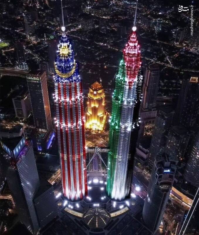 7-پرچم فلسطین و مالزی بر روی برجهای دوقلو این کشور در حمایت از مردم مظلوم غزه و فلسطین نقش بست.
